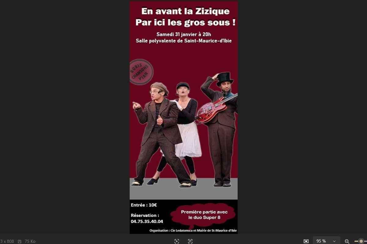 La Mairie de Saint-Maurice-d'Ibie vous propose un spectacle à la salle des fêtes le samedi 31 janvier à 20h. "En avant la Zizique, par ici les gros sous" c'est un concert de reprises de chansons de Boris Vian par trois artistes du sud Ardèche. Cet hommage drôle et touchant pénètre l'univers de Boris Vian, un coeur fragile qui battait au rythme du jazz. C'est l'occasion de ré-entendre certaines chansons mythiques revisitées avec humour et d'en découvrir d'autres qui disent l'urgence de vivre, l'amour, la soif de rire et de faire la nique au destin.