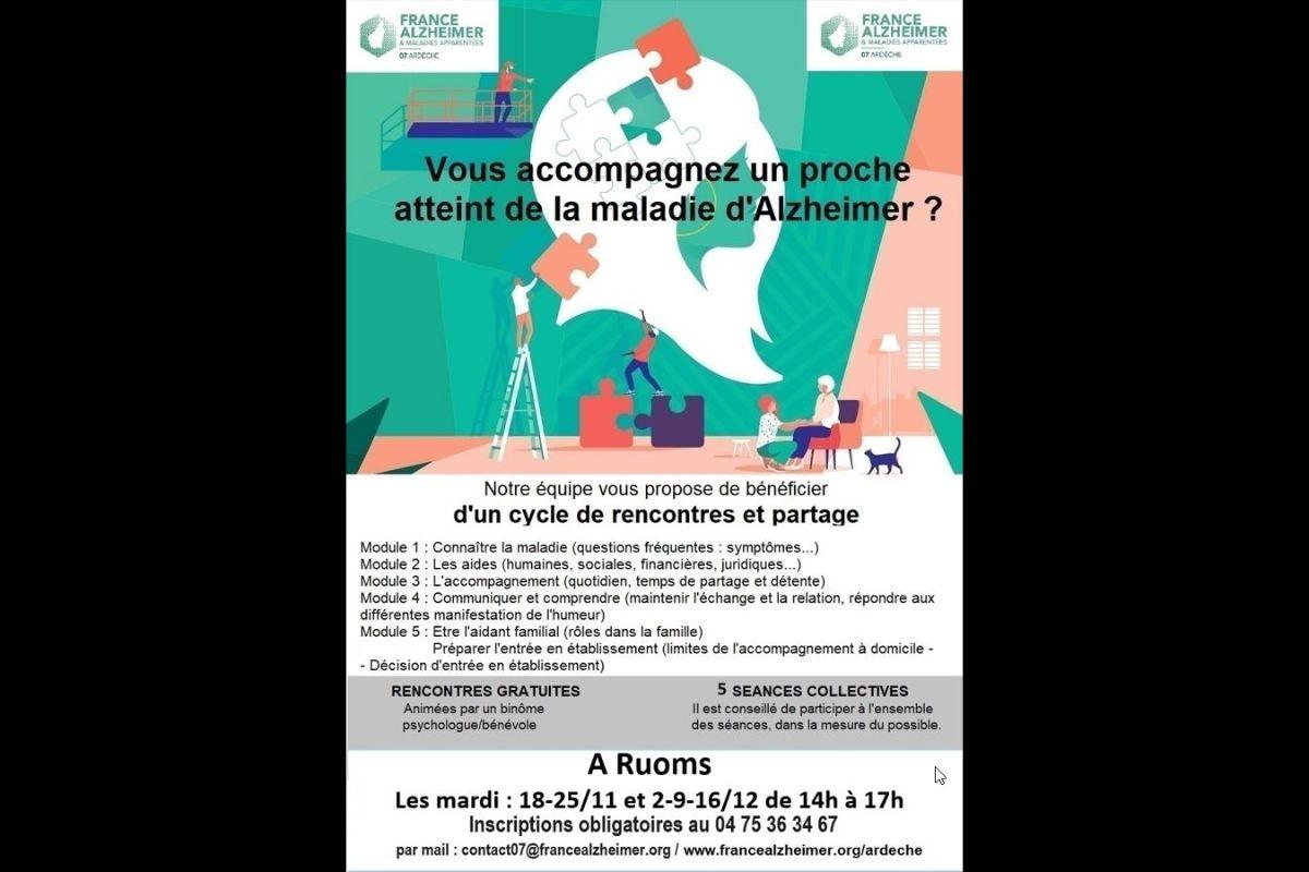 L'association France Alzheimer Ardèche propose une formation gratuite pour les aidants pour le dernier trimestre 2025. Cinq lieux possibles pour y assister :